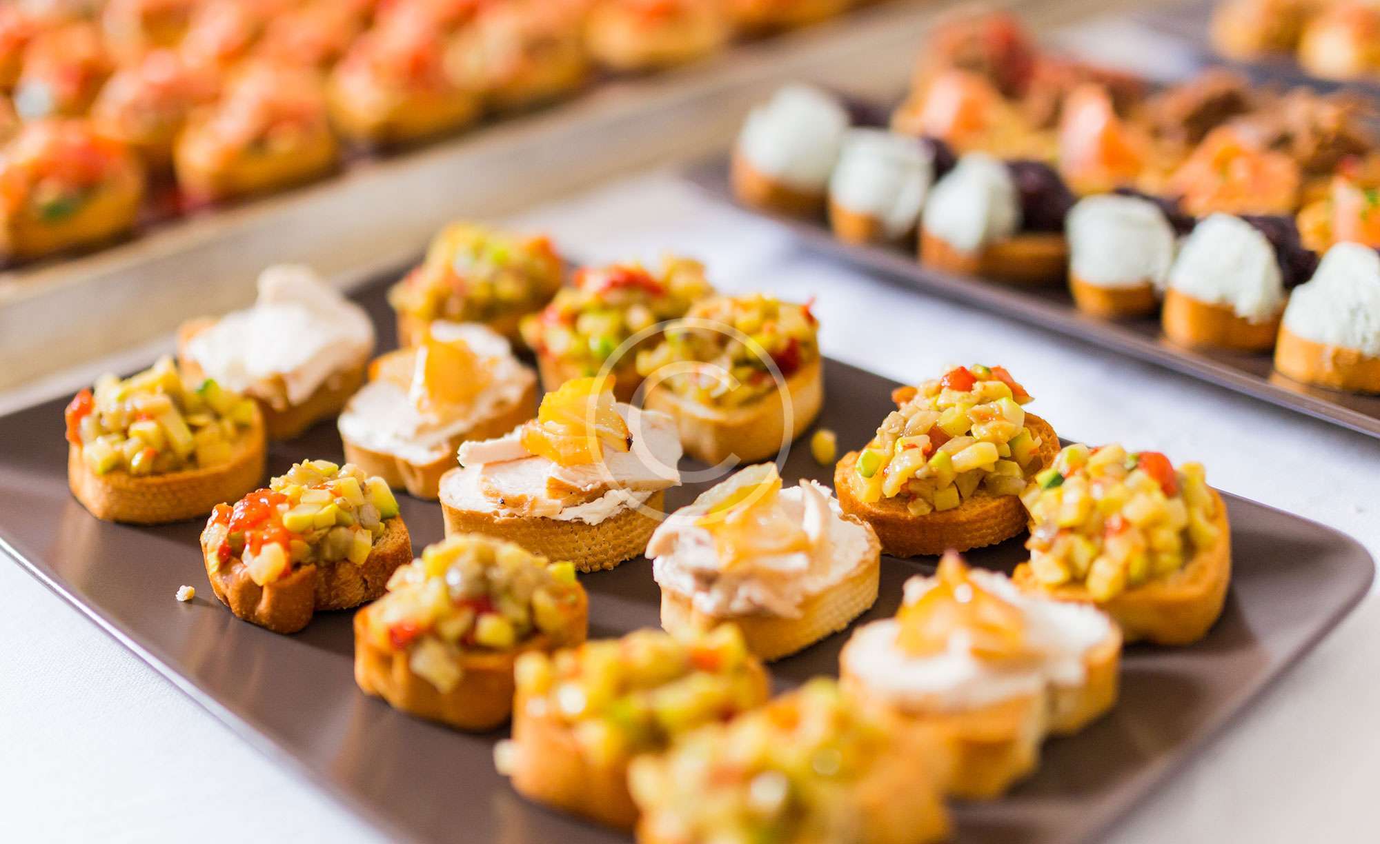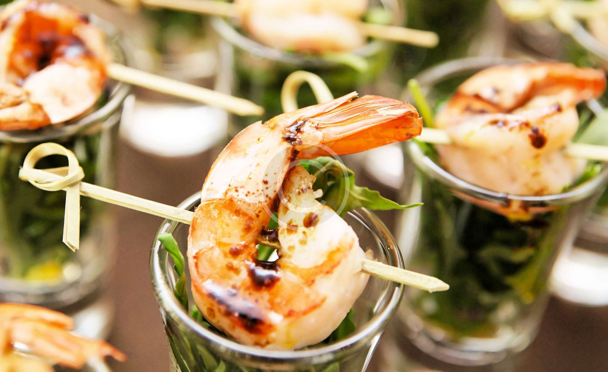 Giant pan seared scallops on skewer. Topped with red curry & basil mango relish